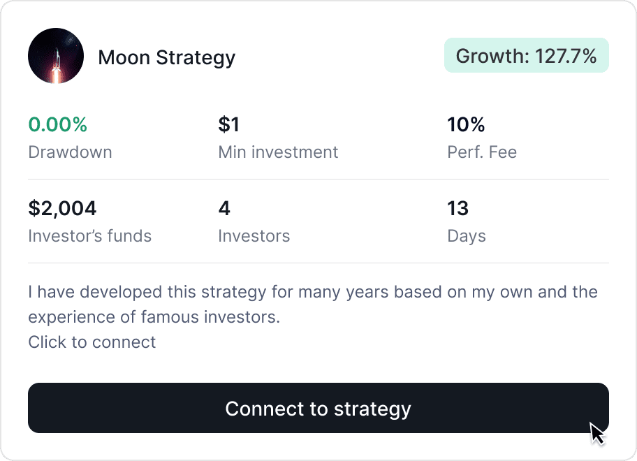 Você pode investir no mesmo Gestor Financeiro até 5 vezes. A nova conta de investidor é criada toda vez que você se conecta à estratégia.